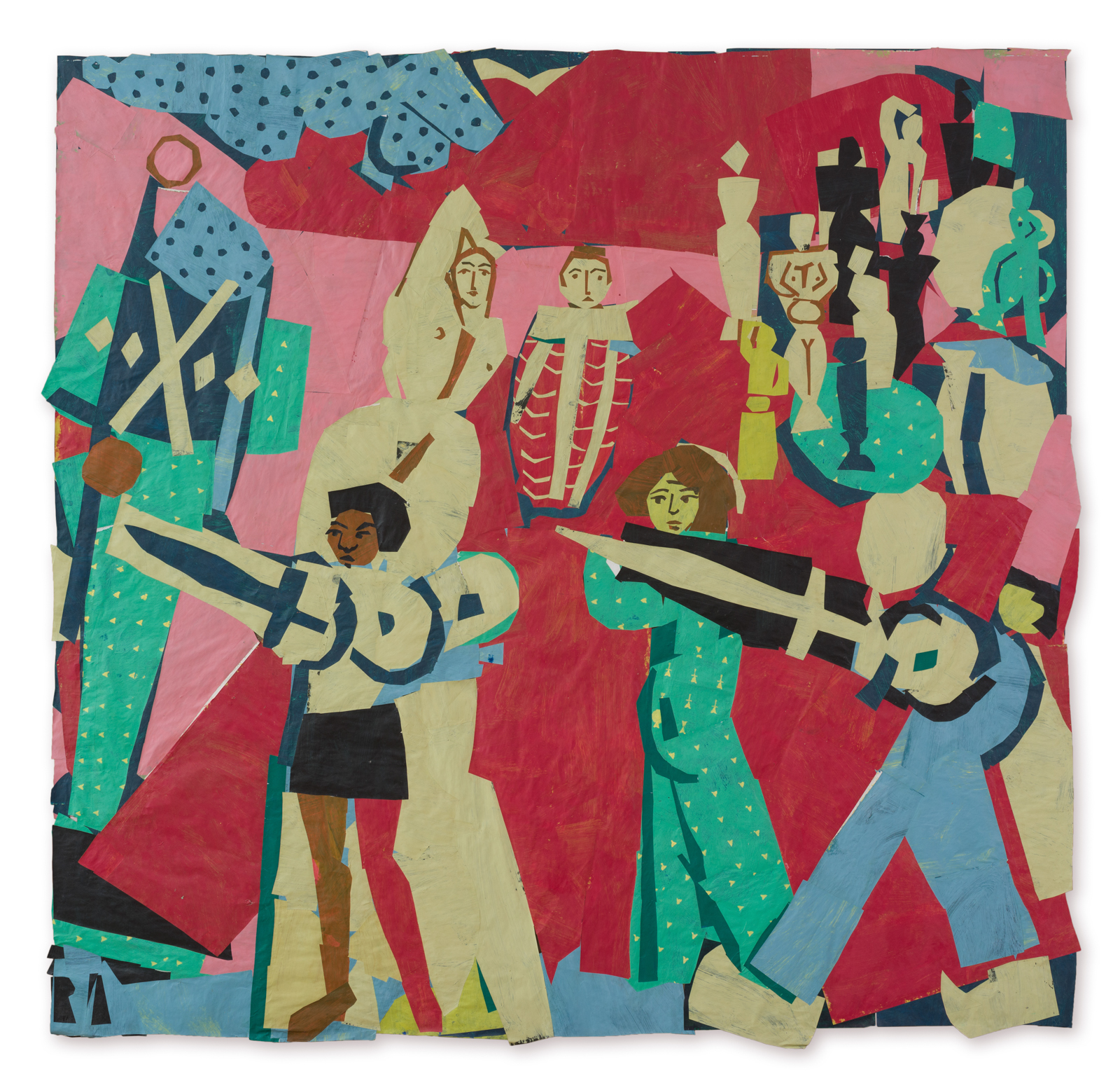The genre of historical painting – which for centuries was the leading genre in Europe – is transformed in Amizur’s hands into an intense and explosive formalist game, in which painterly elements and values prevail over the subject. The culmination of the project, on view here, is an enormous collection of works composed of elements borrowed from the worlds of painting and collage, two types of media founded on artistic concepts and traditions of different, and sometimes divergent, nature. Painting, in its classic forms, is based on observation and thoughts about light, air, tonality and composition, while collage, which is a much younger medium (about a hundred years old), is founded on modernist disassembly: several worlds piled on one another and colliding with each other, to express a broken and torn world that is chaotic rather than harmonious. But unlike the modernist collage, which is usually made of newspaper clippings, photographs and more, the raw material in Amizur’s works is simple white paper, uniformly painted in flat industrial paints of custom hues made to Amizur’s specifications. Occasionally, the paper is covered in two different layers of paint, creating depth and a sense of warmness or coolness. These simple pieces of papers serve as the basis for diverse complex operations and surprising encounters, with which Amizur forges a new and wonderful world. The palette – of countless painted pieces of papers – is the only factor known at the outset. This limitation is a basic given in the work, requiring creative solutions on the artist’s part and resulting in the creation of colorful relationships that would not exist had she access to the usual gamut of colors and hues.